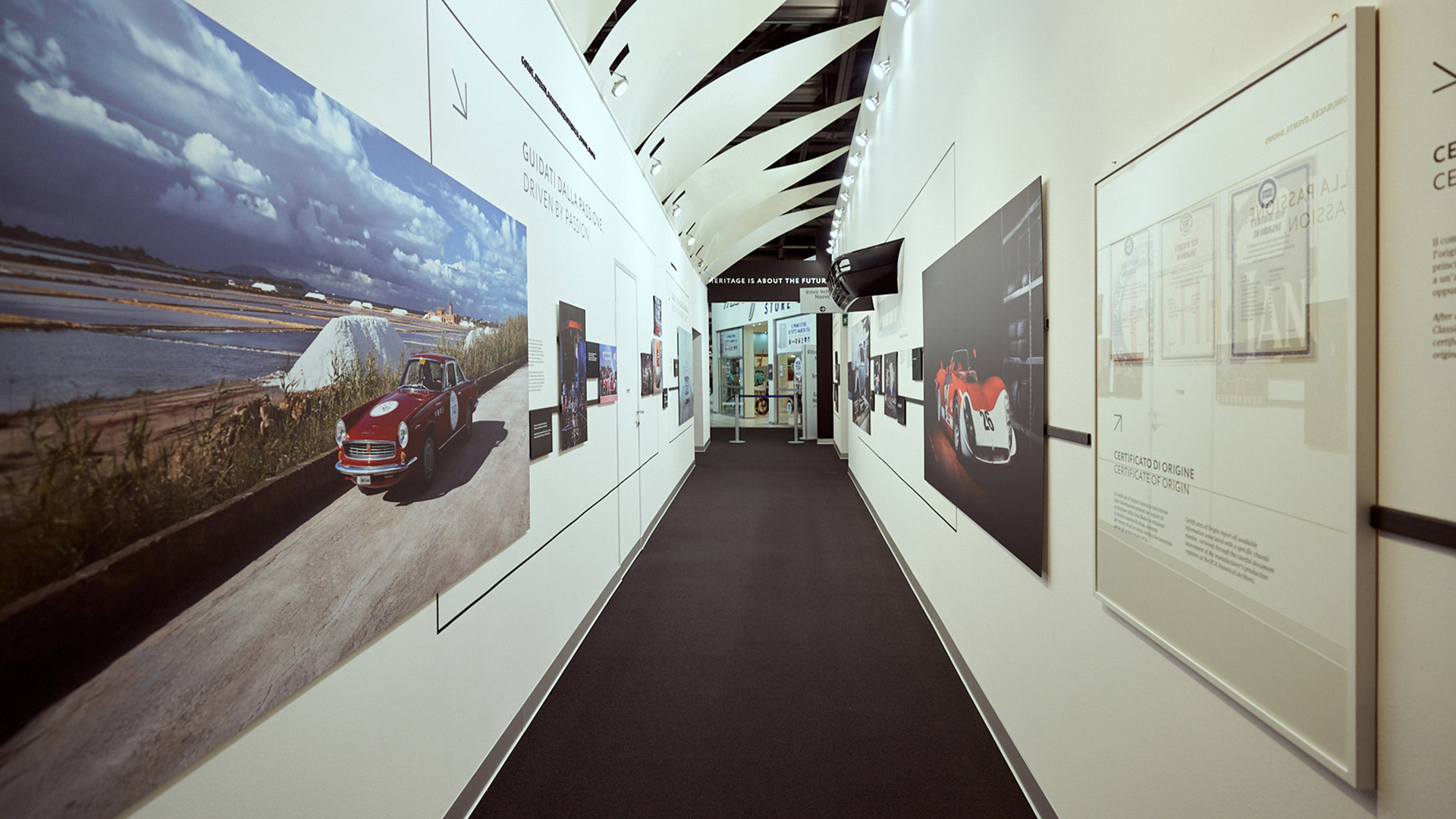 The entrance is made up of two large panels, which showcase the technical drawing of a Fiat Topolino. Almost like a side scene, the two walls appear to open up and invite visitors to discover a journey that is rich in stories, information and curiosities about the world of FCA Heritage.